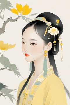 (chinese traditional minimalism:1.3), Close-up Portrait, Left View, Chinese eenchanting Maiden, Charming smile, solo,1girl, incredibly beautiful, elegant, pale yellow color matching, white background, hair, hair accessories, earrings,
