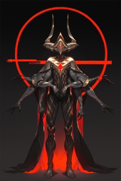 score_9, score_8_up, score_7_up, best quality, masterpiece, <lora:jijia-pony-Tanger-000006:0.8>, jijia, 2d, anime, solo, red eyes, full body, extra arms, standing, looking at viewer, glowing, barefoot, science fiction, a drawing of a woman dressed in black and red, a dark figure with a cape and red light,