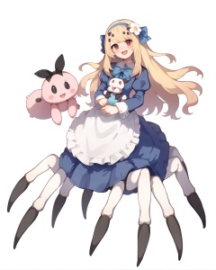 score_9, score_8_up, score_7_up, best quality, masterpiece, <lora:jijia-pony-Tanger-000006:0.8>, jijia, 2d, anime, arachne, spider girl, 1girl, arthropod girl, monster girl, solo, dress, long hair, blonde hair, blue dress, white background, open mouth, bow, smile, stuffed toy, taur, simple background, looking at viewer, long sleeves, :d, stuffed bunny, stuffed animal, arthropod limbs, puffy sleeves, blue bow, hair ornament, full body, red eyes, juliet sleeves, extra eyes, ribbon, hairband, multiple legs, flower, bangs, blush, black bow, hair bow, hair flower, a character holding a spider in her hands