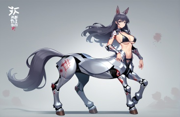 score_9, score_8_up, score_7_up, score_6_up, <lora:jijia-pony-Tanger-000006:0.8>,jijia, 2d, anime, taur, 1girl, monster girl, solo, breasts, long hair, centaur, full body, horse ears, looking at viewer,animal ears, sidelocks, large breasts, bangs, standing, multiple legs, grey background, armor, mechanical legs, horse tail, tail, grey hair, centauroid,black hair, black Bikini armor, cool, bloody stream,empty hands,pov hands,artist signature,no weapon
