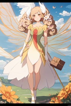 1girl, solo, brown hair, dress, flower, wings, sky, day, cloud, letterboxed, houtufeng