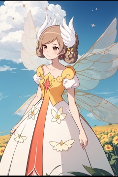1girl, solo, brown hair, dress, flower, wings, sky, day, cloud, letterboxed, houtufeng