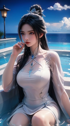 High quality, masterpiece, cinematic texture, Chinese elements, 1 girl bathing in the pool, (wrapped in a towel: 1.2),Forehead gemstone, (with a large amount of water vapor on the surface: 1.5), (hot spring), lantern, night,LXQ