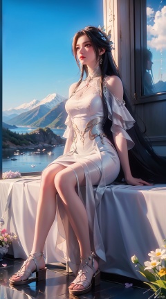 best quality, masterpiece, illustration, (reflection light), incredibly absurdres, ((Movie Poster), (signature:1.3), (English text), 1girl, girl middle of flower, pure sky,clear sky, outside, collarbone, sitting, absurdly long hair, clear boundaries of the cloth, white dress, fantastic scenery, ground of flowers, thousand of flowers, colorful flowers, flowers around her, various flowers,bare shoulders,skirt, sandals,