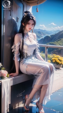 best quality, masterpiece, illustration, (reflection light), incredibly absurdres, ((Movie Poster), (signature:1.3), (English text), 1girl, girl middle of flower, pure sky,clear sky, outside, collarbone, sitting, absurdly long hair, clear boundaries of the cloth, white dress, fantastic scenery, ground of flowers, thousand of flowers, colorful flowers, flowers around her, various flowers,bare shoulders,skirt, sandals,