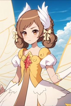 1girl, solo, brown hair, dress, flower, wings, sky, day, cloud, letterboxed, houtufeng, Stand