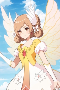 1girl, solo, brown hair, dress, flower, wings, sky, day, cloud, letterboxed, houtufeng, Stand,Fairy