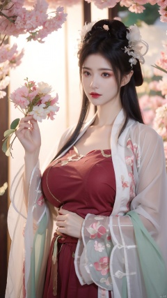 masterpiece,qingyi,danya,1girl,black hair,hanfu,(flower:1.36),realistic,hair ornament,chinese clothes,(red-green dress:1.23),black eyes,long sleeves,holding,holding flower,,hanfu,cho girl, longfeihanfu,looking at viewer,(big breasts:1.61)