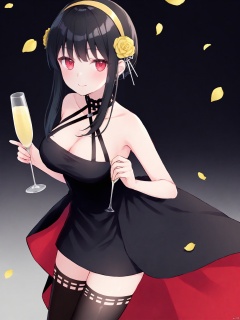 Best-A,shano_hiyori,1girl, absurdres, alcohol, bare_shoulders, black_dress, black_hair, black_thighhighs, breasts, champagne, champagne_flute, cleavage, closed_mouth, cowboy_shot, cup, dress, drink, drinking_glass, flower, gradient_background, hair_flower, hair_ornament, hairband, highres, holding, holding_cup, holding_weapon, looking_at_viewer, medium_breasts, petals, red_eyes, rose, shano_hiyori, short_hair_with_long_locks, sidelocks, simple_background, sleeveless, sleeveless_dress, smile, solo, spy_x_family, thighhighs, two-sided_dress, two-sided_fabric, waist_cape, weapon, yellow_flower, yellow_hairband, yellow_rose, yor_briar, zettai_ryouiki