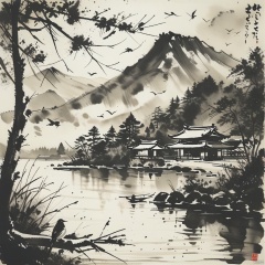 (ink-style, ink_wash_painting),(masterpiece,best quality), scenery, bird, east asian architecture, architecture, water, mountain, outdoors, river, lake,painting \(medium\), traditionalmedia,branch,watercolor\(medium\),