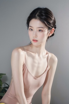 HDR,UHD,8K,Highly detailed,best quality,masterpiece,masterpiece, best quality, realistic,1girl,loli,upper body,fov, sitting,leotard,pink leotard,white skin,simple background,Studio lighting,(EOS R8,50mm,F1.2,8K,RAW photo,frontlight,(((masterpiece))), ((the best quality, super fine illustrations,)), ((very delicate light)), ((fine lighting,very fine 8KCG wallpapers)),