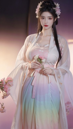masterpiece,qingyi,danya,1girl,black hair,hanfu,(flower:1.5),realistic,hair ornament,chinese clothes,(Rainbow gradient colors dress:1.39),black eyes,long sleeves,holding,holding flower,,hanfu,cho girl, longfeihanfu,looking at viewer,(big breasts:1.79)