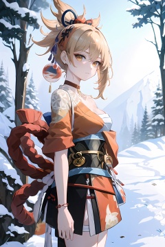 (masterpiece, best quality:1.2),insanely detailed,absurdres,ultra-highres,ultra-detailed,best quality,slender,kawaii,perfect symmetrical face,ultra cute girl,ultra cute face,ultra detailed eyes,ultra cute,ultra beautifu,<lora:Yoimiya-000001:1>,yoimiya \(genshin impact\),hair ornament,hadanugi dousa,yellow eyes,1girl,solo,japanese clothes,kimono,sarashi,bandages,geta,arm tattoo,shimenawa,chest tattoo,sash,red choker,bandaged leg,rope,pouch,bandaged arm,breasts,jewelry,kinchaku,single glove,hair ribbon,asymmetrical legwear,outdoors,standing,nature,