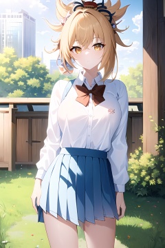 (masterpiece, best quality:1.2),insanely detailed,absurdres,ultra-highres,ultra-detailed,best quality,slender,kawaii,perfect symmetrical face,ultra cute girl,ultra cute face,ultra detailed eyes,ultra cute,ultra beautifu,<lora:Yoimiya-000001:1>,yoimiya \(genshin impact\),hair ornament,hadanugi dousa,yellow eyes,1girl,solo,school uniform,outdoors,standing,nature,