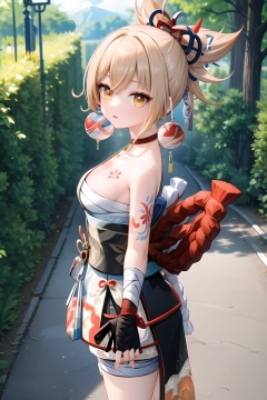(masterpiece, best quality:1.2),insanely detailed,absurdres,ultra-highres,ultra-detailed,best quality,slender,kawaii,perfect symmetrical face,ultra cute girl,ultra cute face,ultra detailed eyes,ultra cute,ultra beautifu,<lora:Yoimiya-000001:1>,yoimiya \(genshin impact\),hair ornament,hadanugi dousa,yellow eyes,1girl,solo,japanese clothes,kimono,sarashi,bandages,geta,arm tattoo,shimenawa,chest tattoo,sash,red choker,bandaged leg,rope,pouch,bandaged arm,breasts,jewelry,kinchaku,single glove,hair ribbon,asymmetrical legwear,outdoors,standing,nature,