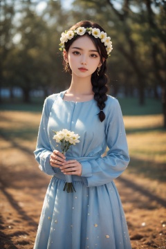 lj, 1girl, solo, black hair, braid, flower, smile, holding, outdoors, tree, blurry, blurry background, skirt, long sleeves, long hair, photo background, looking at viewer, head wreath, holding flower, nature, standing, dress, hair ornament, day, blue shirt, hair flower
