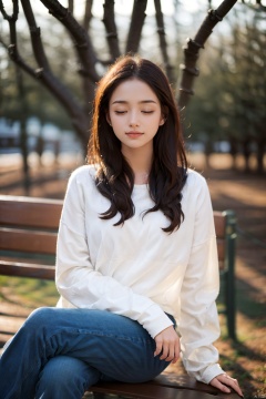 lj, 1girl, solo, realistic, sitting, long hair, outdoors, brown hair, shirt, tree, jeans, crossed legs, white shirt, long sleeves, smile, blurry, bench, closed eyes, photo background