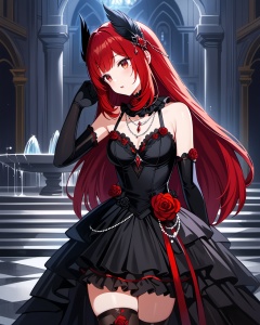 very aesthetic,aesthetic,(amazing quality),best quality,hight,hight quality,masterpiece,highres BREAKbeautiful eyes,luminous eyes,gentle eyes,Volumetric Lighting,Cinematic Lighting,oil_painting,((classicism)),depth of field,<lora:beila-asoul-a3a:0.65>,1girl,red eyes,red hair,long hair,rose,breasts,black elbow gloves,black wedding dress,black thighhighs,flower,black feather hair ornament,detached collar,fountain,church,background light,mole under eye,