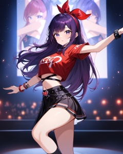 very aesthetic,aesthetic,(amazing quality),best quality,hight,hight quality,masterpiece,highres BREAKbeautiful eyes,luminous eyes,gentle eyes,Volumetric Lighting,Cinematic Lighting,oil_painting,((classicism)),depth of field,<lora:beila-asoul-a3a:0.6>,1girl,long hair,purple hair,midriff,red crop top,black skirt,red shirt,asymmetrical legwear,bracelet,red hair bow,clothes writing,heart belt,stage,dancing,mole under eye,looking at viewer,