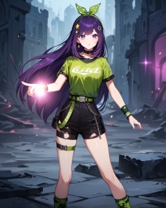 very aesthetic,aesthetic,(amazing quality),best quality,hight,hight quality,masterpiece,highres BREAKbeautiful eyes,luminous eyes,gentle eyes,Volumetric Lighting,Cinematic Lighting,oil_painting,((classicism)),depth of field,<lora:beila-asoul-a3a:0.6>,1girl,purple hair,long hair,purple eyes,green shoes,green hair bow,green shirt,earrings,green belt,star hair ornament,thigh strap,wristband,green hairband,black short,ruins,pointing,