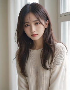 japanese woman, (close-up:2), (natural lighting),wavy hair, forehead, (dark brown eyes),(from side), (downward slanting eyes),pouty,(white sweater),(dyanmic posing)(see-through curtain, bright room)