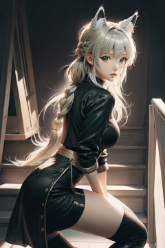(masterpiece),best quality,from_side,Dark environment,Stand on one foot,Stand against the wall,One knee up,Lift one foot,Put foot against the opposite wall,1girl,shirakami fubuki,virtual youtuber,animal ears,fox ears,fox girl,white hair,fox tail,jacket,thigh strap,long hair,ahoge,bangs,braid,fur trim,green eyes,hair between eyes,stairs,sidelocks,looking at viewer,by anmi,