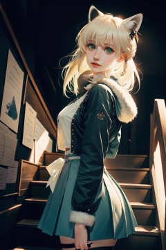 (masterpiece),best quality,from_side,Dark environment,Stand on one foot,Stand against the wall,One knee up,Lift one foot,Put foot against the opposite wall,1girl,shirakami fubuki,virtual youtuber,animal ears,fox ears,fox girl,white hair,fox tail,jacket,thigh strap,long hair,ahoge,bangs,braid,fur trim,green eyes,hair between eyes,stairs,sidelocks,looking at viewer,by ajimita,