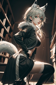 (masterpiece),best quality,from_side,Dark environment,Stand on one foot,Stand against the wall,One knee up,Lift one foot,Put foot against the opposite wall,1girl,shirakami fubuki,virtual youtuber,animal ears,fox ears,fox girl,white hair,fox tail,jacket,thigh strap,long hair,ahoge,bangs,braid,fur trim,green eyes,hair between eyes,stairs,sidelocks,looking at viewer,