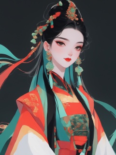 anangc,1girl,solo,jewelry,earrings,black background,long hair,looking at viewer,makeup,multicolored hair,black hair,red lips,chinese clothes,simple background,tassel earrings,upper body,floating hair,tassel,green hair,closed mouth,long sleeves,eyeshadow,white background,