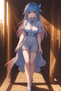 1girl, solo, long hair, looking at viewer, smile, bangs, blue eyes, hair ornament, thighhighs, dress, closed mouth, full body, pink hair, high heels, white thighhighs, petals, blue dress, Lie on the bed with your legs open,Full body shot.,medium breasts,spread legs,The whole body,
