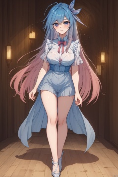 1girl, solo, long hair, looking at viewer, smile, bangs, blue eyes, hair ornament, thighhighs, dress, closed mouth, full body, pink hair, high heels, white thighhighs, petals, blue dress, Lie on the bed with your legs open,Full body shot.,medium breasts,spread legs,The whole body,