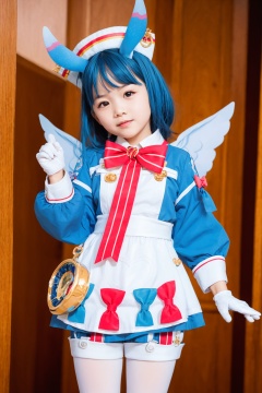masterpiece, best quality,(photoshop \(medium\):1.4), <lora:sigewinne-v2:1>,(sigewinne (genshin impact):0),1girl,animal ears,hat,blue hair,multicolored hair,two side up,red eyes,bow,bowtie,blue dress,white apron,wings,long sleeves,white gloves,shorts,white pantyhose, cowboy shot,