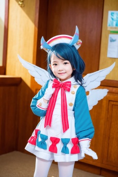 masterpiece, best quality,(photoshop \(medium\):1.4),child, <lora:sigewinne-v2:1>,(sigewinne (genshin impact):0),1girl,animal ears,hat,blue hair,multicolored hair,two side up,red eyes,bow,bowtie,blue dress,white apron,wings,long sleeves,white gloves,shorts,white pantyhose, cowboy shot,light smile,indoors,in hospital, medical room,