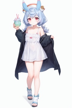 masterpiece, best quality, <lora:sigewinne-v2:1>, 1girl, solo, red eyes, drinking straw, hat, white background, holding, white headwear, cup, slippers, holding cup, white footwear, animal ears, full body, standing, bangs, off shoulder, blue hair, open clothes, low twintails, notice lines, bare shoulders, simple background, mob cap, twintails, short eyebrows, dress, jacket, strap slip, long sleeves, thick eyebrows, blush stickers, long hair, white dress, collarbone, blue jacket, looking at viewer, braid, blush, horns, bendy straw, open jacket, bow, multicolored hair, sleeveless