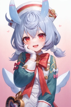 masterpiece, best quality, <lora:sigewinne-v2:1>, 1girl, solo, red eyes, heart, animal ears, gloves, twintails, smile, hand on own face, open mouth, looking at viewer, hand on own cheek, low twintails, rabbit ears, bow, white gloves, long sleeves, blue hair, long hair, tail, halo, hair between eyes, bangs, hat, symbol-shaped pupils, teeth, gradient background, :d, gradient, red bow, upper body
