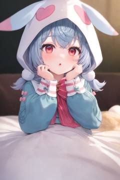 masterpiece, best quality, <lora:sigewinne-v2:1>, 1girl, solo, red eyes, lying, hood, on stomach, animal hood, blush, hair ornament, bangs, long sleeves, looking at viewer, bow, puffy long sleeves, no shoes, blurry, red bow, twintails, low twintails, virtual youtuber, parted lips, blue hair, hood up, pink hoodie, rabbit hood, puffy sleeves, depth of field, thighhighs, grey hair, white thighhighs, hairclip, hoodie, animal ears, :o, sleeves past wrists, blurry background, rabbit ears, head rest, blurry foreground, long hair, fake animal ears, white pantyhose, heart, blue bow
