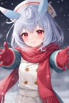 masterpiece, best quality, <lora:sigewinne-v2:1>, 1girl, solo, smile,animal ears, looking at viewer, scarf, hat, blue hair, blush, upper body, winter clothes, breath, mittens, coat, red gloves, closed mouth, snowing, bangs, blurry, short hair, red scarf, hair bun, snow, red eyes, outstretched arms
