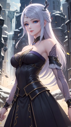 1girl, solo, blue eyes, white hair, black dress, jewelry, bare shoulders, detached sleeves, long hair, earrings, strapless dress, mischevious smile, perfect body, scenery, sharp focus, best quality, masterpiece, detailed outfit, illustration, perfect eyes, finely detailed beautiful anime eyes, realistic skin, intricate details, best lighting, depth of field, ultra high resolution,cowboy_shot, dynamic pose, dynamic angle,