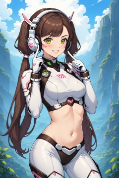 1girl,solo,long hair,breasts,looking at viewer,blush,smile,bangs,brown hair,gloves,long sleeves,navel,twintails,medium breasts,green eyes,upper body,parted lips,midriff,white gloves,hand up,stomach,grin,crop top,cosplay,bodysuit,headphones,low twintails,facial mark,short twintails,index finger raised,arm behind back,whisker markings,d.va \(overwatch\),<lora:蔚蓝Blue2D游戏角色tusi:1.5> <lora:蔚蓝Blue中国龙SDXL:0.8> <lora:蔚蓝Blue_ROPG游戏_SDXL_Pony:0.8>
