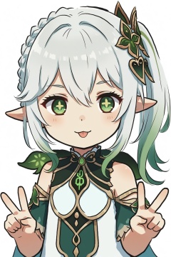 xinzoruo, 1girl, solo, long hair, looking at viewer, blush, smile, bangs, simple background, hair ornament, white background, hair between eyes, green eyes, braid, white hair, sidelocks, multicolored hair, green hair, tongue, pointy ears, tongue out, side ponytail, symbol-shaped pupils, v, gradient hair, :p, double v, female child, nahida \(genshin impact\)