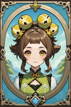 solo,YAOYAO\(genshin impact\),portrait,upper_body,highres,Game cards, beautiful borders, masterpieces, perfect symmetry, golden ratio