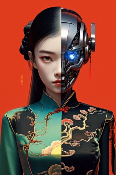 banlanz,jewelry,cyborg,black hair,1gril,looking at viewer,solo,chinese clothes,simple background,<lora:banlian1.5-:0.8>,upper body,, masterpiece, best quality,