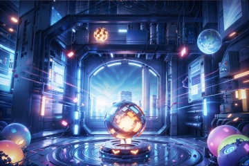 The image is a depiction of a futuristic and alien structure. It is a large, glowing sphere surrounded by intricate metal scaffolding. The sphere is made up of a series of interlocking hexagons, each of which is glowing with a different color. The scaffolding is made up of a series of metal rods and beams, which are arranged in a complex pattern. The structure is surrounded by a number of small, glowing objects, which may be drones or other types of machinery. The background is a dark void, which is filled with stars and other celestial objects.