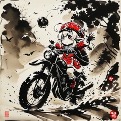 (ink_style,ink_wash_painting),(masterpiece,best quality),1girl, The chase. The distance, The moonlit night, klee with red hat on motorbike behind waving and calling out to qiqi,