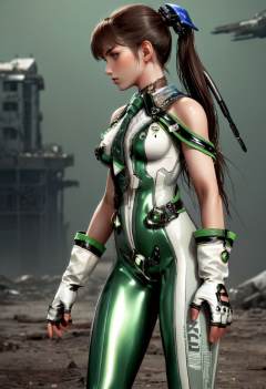 post apocalyptic landscape, attractive tall woman,(eve, brown hair, white fingerless gloves, brown eyes, green bodysuit, shiny):1(best quality,masterpiece,photo-realistic):1.0,, (hyperdetailed,finely detailed,intricate detail):1.0,, from side,grey background, astrophotography, 4k <lora:eve_xl_v1.0:.7>
