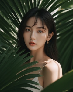 cinematic photo a woman standing in front of a palm leaf, a picture, inspired by Li Fangying, jinyoung shin aesthetic, editorial footage, avatar image, lovely delicate face, beauty retouch, very very very realistic,upper_body, 1girl . 35mm photograph, film, bokeh, professional, 4k, highly detailed