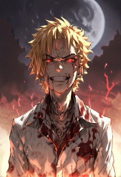 masterpiece, best quality,1boy, male focus,   solo, red eyes, glowing, glowing eyes, glowing eye, blood on clothes, blood, smile, tattoo, clenched teeth, teeth, full moon, blood on face, spiked hair, portrait, eyebrows, grin, collared shirt, red moon, aura, facial tattoo, white shirt, shirt, moon, electricity, sanpaku, angry, blonde hair, hair over one eye, looking at viewer <lora:DInoballXLlokr8f-000185:0.95>