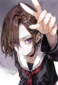 masterpiece, best quality,1girl, solo, looking at viewer, cross earrings, choker, hair over one eye, cross, hair ornament, purple eyes, earrings, short hair, jewelry, upper body, black choker, sailor collar, cross hair ornament, closed mouth, school uniform, brown hair, serafuku, long sleeves, shirt, breasts, necklace, red ribbon, ribbon, hairclip, eyelashes, latin cross, eyes visible through hair, parted bangs, frown, glaring, black shirt, bags under eyes <lora:DInoballXLlokr8f-000185:0.95>