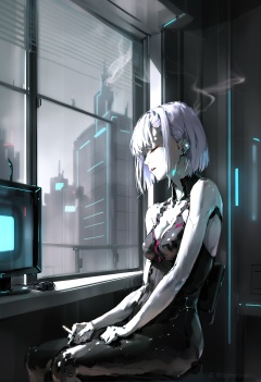 masterpiece, best quality,1girl, lucy \(cyberpunk\),  solo, cigarette, smoke, short hair, smoking, monochrome, holding, closed eyes, holding cigarette, indoors, bare shoulders, reflection, teeth, alternate universe, twitter username, bare arms, monitor, upper body, cable, bodysuit, sitting, greyscale, parted lips, breasts, science fiction, window, cityscape, hand in own hair, cyberpunk, medium breasts, window blinds, cleavage <lora:DInoballXLlokr8f-000185:0.95>