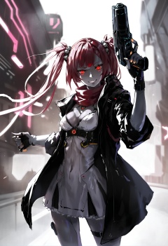 masterpiece, best quality, masterpiece, best quality,1girl,   red scarf, red hair, red eyes, 1011ta dress, cyberpunk, handgun, open clothes, scarf, solo, twintails, dress, medium breasts, coat, cyborg, smile, glowing, trigger discipline, open dress, glowing eyes, cleavage, black coat, fingerless gloves, extra arms, grey skin, breasts, cowboy shot, standing, looking at viewer, black-framed eyewear, spikes, german text, short dress, colored skin, cropped legs, holding gun, no bra, holding, grin, gloves, black gloves, revolver <lora:DInoballXLlokr8f-000185:0.95>